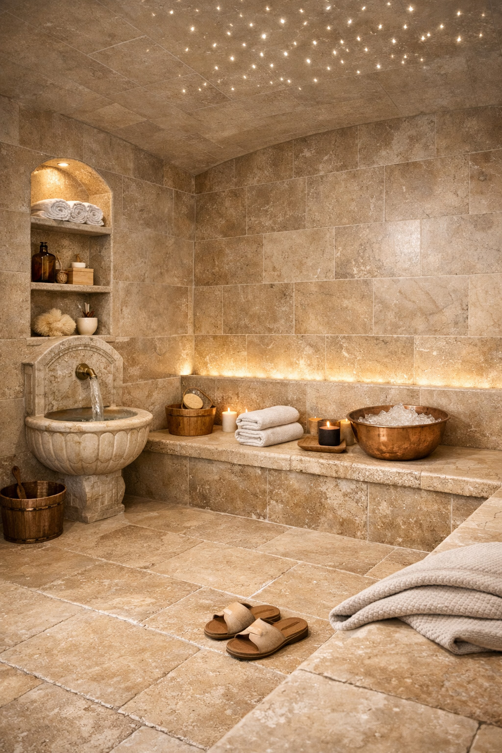 A rustic cobbled Turkish travertine, it has a magnificent range of browns and beige and a stunning rustic feel when installed.